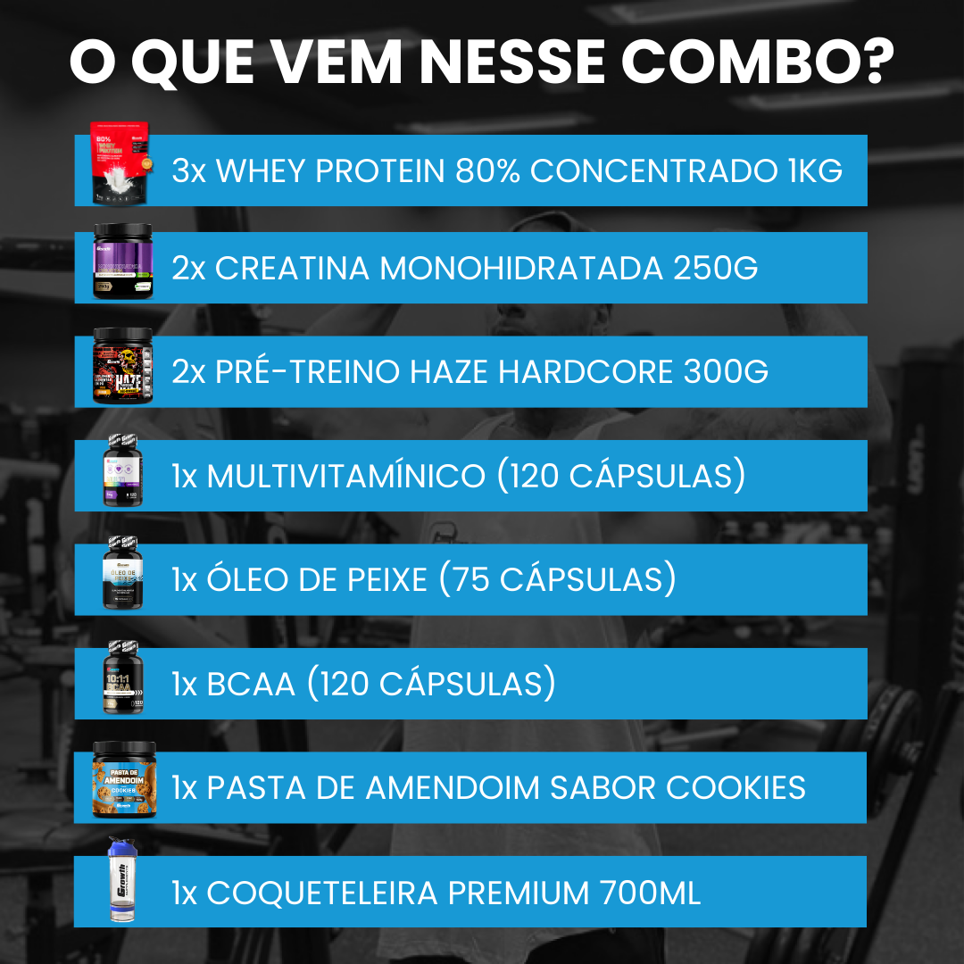 Inclui também um Multivitamínico com 120 cápsulas, um Óleo de Peixe com 75 cápsulas e um BCAA com 120 cápsulas, todos essenciais para garantir a saúde, promover a recuperação muscular e manter o equilíbrio nutricional. O Multivitamínico fornece os nutrientes necessários para o bom funcionamento do corpo, enquanto o Óleo de Peixe apoia a saúde cardiovascular e o BCAA ajuda na preservação da massa muscular.